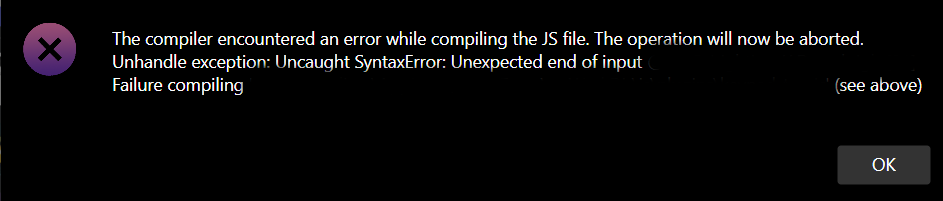 During compilation, nwjc (NW.js' compiler) will process the JavaScript file using the V8 engine (the built-in interpreter for JS). If the compiler encounters an issue, you will see this error message. The error can been seen in the DevTools as well while building the game.